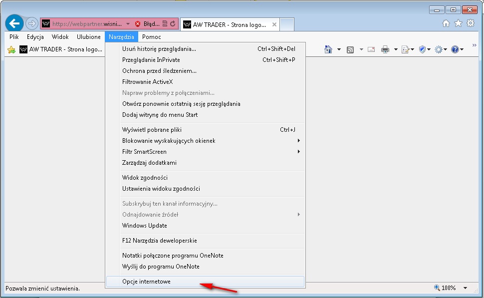 Aby sprawdzić ustawienia zapisywana plików cookie należy z meny wybrać Narzędzia – Opcje internetowe