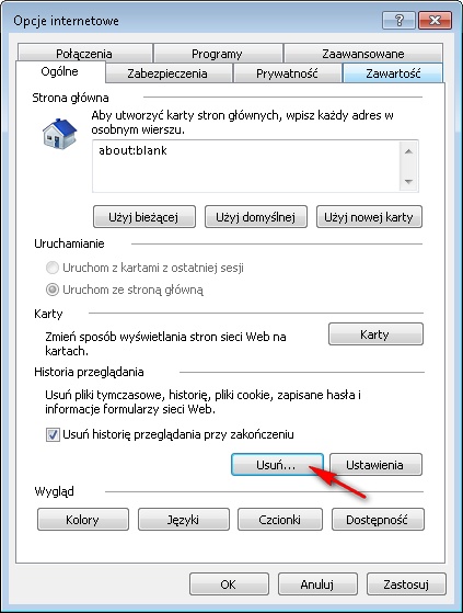A następnie kliknąć przycisk Usuń dotyczący Histori przeglądania