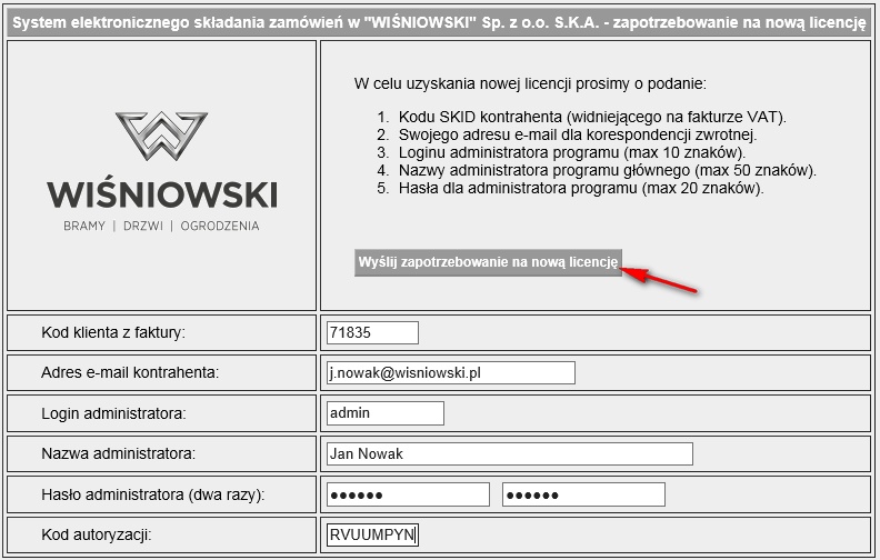 Po uzupełnieniu formularza należy kliknąć przycisk Wyślij zapotrzebowanie na nową licencję