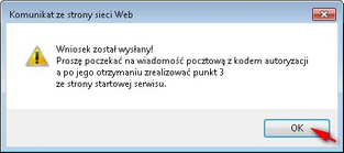 Należy sprawdzić skrzynkę pocztową. Powinny pojawić się dwie nowe wiadomości. Pierwsza z kopią wniosku o wydanie kodu autoryzacji, ten mail przychodzi automatycznie.