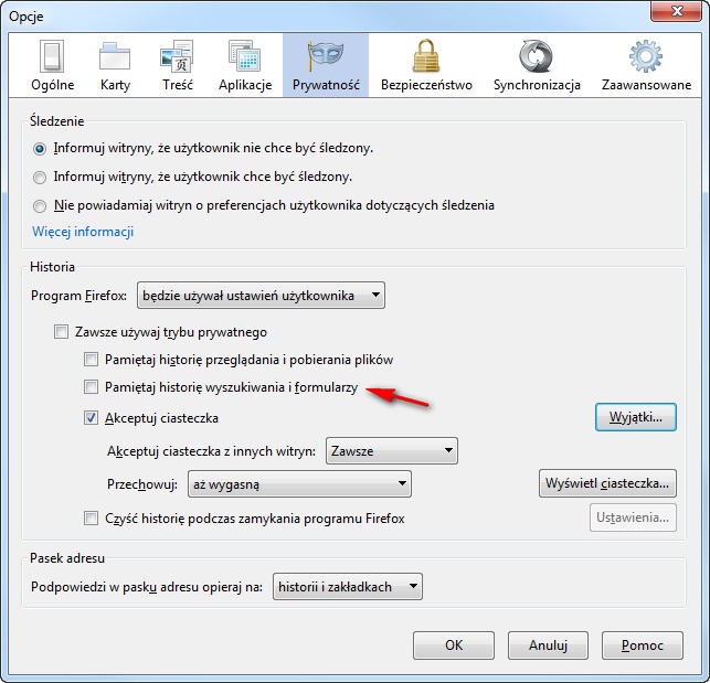 Najbardziej optymalne będą ustawienia jak na zrzucie poniżej, najważniejsze to odznaczony checbox Pamiętaj historię wyszukiwania i formularzy.