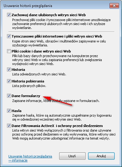 W oknie Usuwania historii przeglądania musi być zaznaczone Dane formularzy